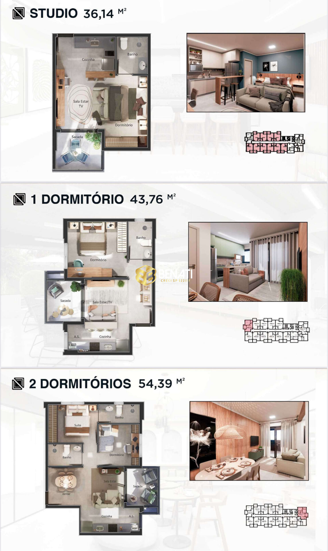 • 1 dormitório com 43,76 m², unidades iniciando em R$ 354.213,32 (esgotado)